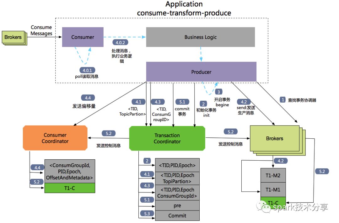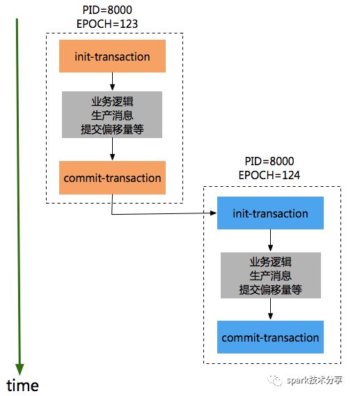 为了避免这种错误,同一个事务ID,只有保证如下顺序epch小producer执行init-transaction和committransaction,然后epoch较大的procuder才能开始执行init-transaction和commit-transaction,如下顺序: