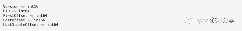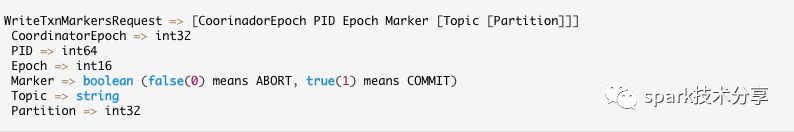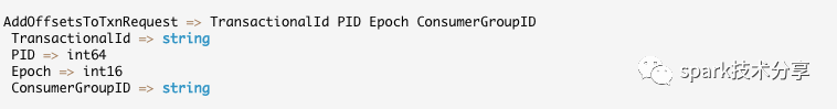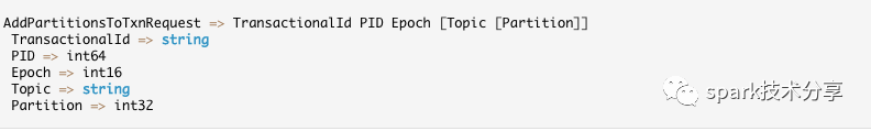 在producer执行send操作时,如果是第一次给<topic,partion>发送数据,此时会向Trasaction Corrdinator发送一个AddPartitionsToTxnRequest请求,Transaction Corrdinator会在transaction log中记录下tranasactionId和<topic,partion>一个映射关系,并将状态改为begin。AddPartionsToTxnRequest的数据结构如下: