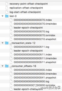 kafka文件主要包括broker的data(主题:test)、事务协调器对应的transaction_log(主题:__tranaction_state)、偏移量信息(主题:_consumer_offsets)三种类型。如下图