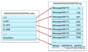 这三种文件类型其实都是topic的分区,所以对于每一个目录都包含*.log、*.index、*.timeindex、*.txnindex文件(仅这个文件是为了实现事务属性引入的)。segment和segmengt对应index、timeindex、txnindex文件命名中序号表示的是第几个消息。如下图中,00000000000000368769.index和00000000000000568769.log中“368969”就是表示文件中存储的第一个消息是468969个消息。