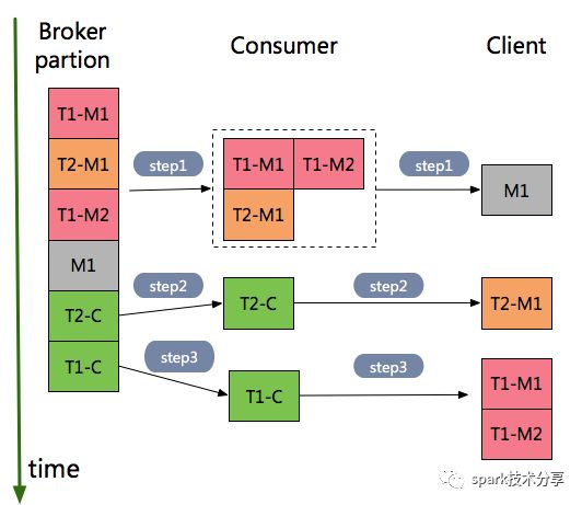 如下图中,按顺序保存到broker中消息有:事务1消息T1-M1、对于事务2的消息有T2-M1、事务1消息T1-M2、非事务消息M1,最终到达client端的循序是M1-> T2-M1 -> T1-M1 -> T1-M2。