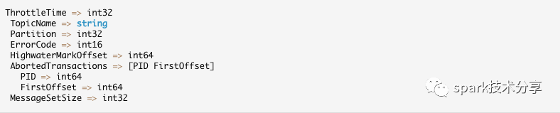 ThrottleTime [TopicName [Partition ErrorCode HighwaterMarkOffset AbortedTransactions MessageSetSize MessageSet]]