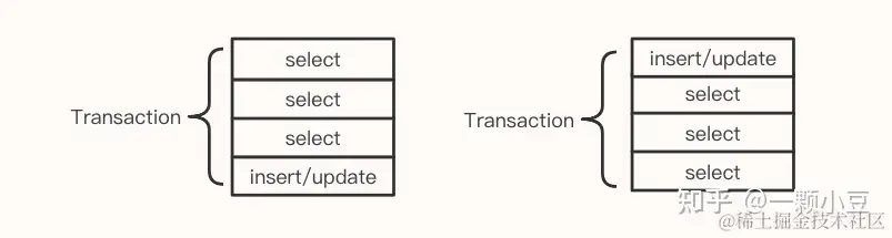 事务内操作由于原子性、隔离级别等限制,从节点不一定能查到事务内一致性数据,即节点间数据变的不对等,因此不仅要考虑节点的负载情况还要考虑数据的可见一致性(这里指的是事务内外数据的不一致,先不考虑因主从复制导致数据的延迟,这种数据一致性属于另外一个话题,我们暂且认为主从数据是强一致的)。我们可以将事务内的查询请求简单的分为两种类型:先查后改、先改后查,如下图示: