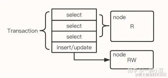 对于第一种情况处理起来相对容易,虽然是在事务内操作,但因为查询时数据没有更改,各从节点数据一致,因此可以延迟事务开始的时机,如将事务开始的位置设置在insert/update语句前的位置,这样前面三条select语句也可以做负载均衡,减少主节点的处理压力。这种场景覆盖面广、比较常见,大多数应用开发也是采用先查后改逻辑,并且一些开发框架会把所有的执行语句都放在事务里,即使是简单的查询,这种方案能够很好的解决这类问题。(说这么多其实就想表明这种场景已经能解决大部分主节点因查询操作压力大的问题,并且第二种场景确实不好解决 )