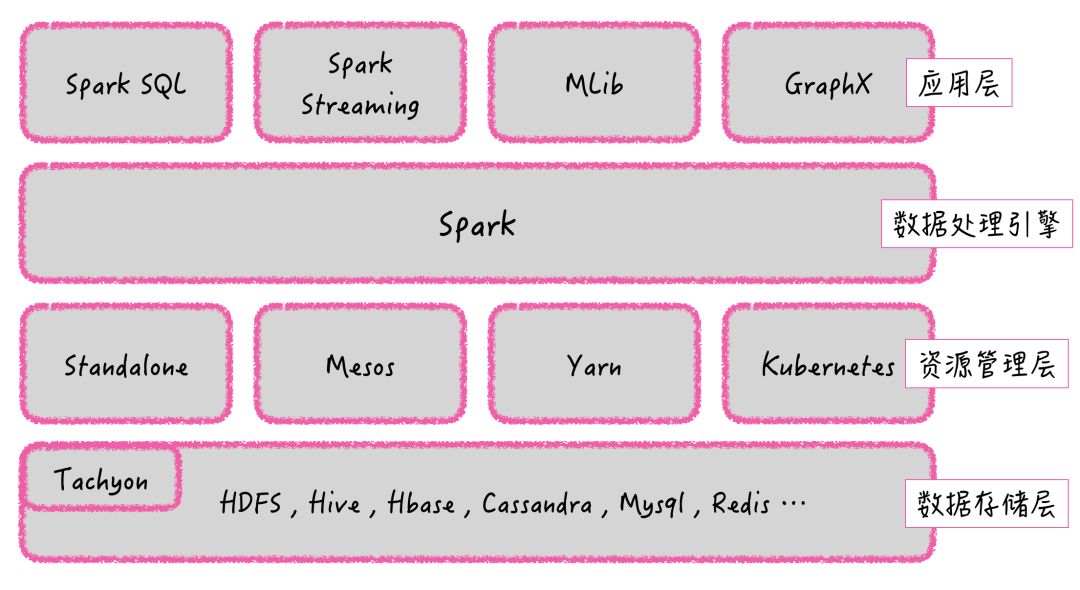 发展至今,Spark 已不仅仅是 MapReduce 的替换方案,它已经发出成了一个包含众多子项目的 Spark 生态。如图 1 所示,Spark 生态可分为四层: