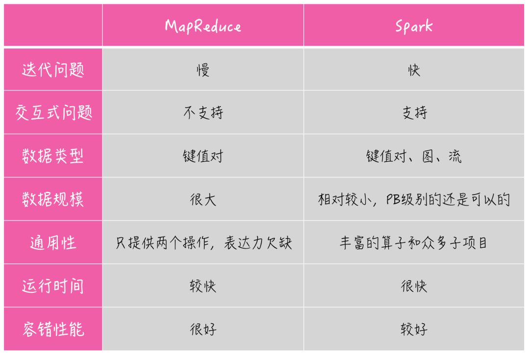 关于最后一点容错性,MapReduce 中每一步操作的结果都会被存入磁盘,在计算出现错误时可以很好的从磁盘进行恢复;Spark 则需要根据 RDD 中的信息进行数据的重新计算,会耗费一定的资源。Spark 提供两种方式进行故障恢复:通过数据的血缘关系再执行一遍前面的处理;Checkpoint 将数据集存储到持久存储中。理论上如果选择在每个完成的小步骤上加 CheckPoint,Spark 的容错性能可以和 MR 达到一样的稳健。当然,很少有人会这么做。