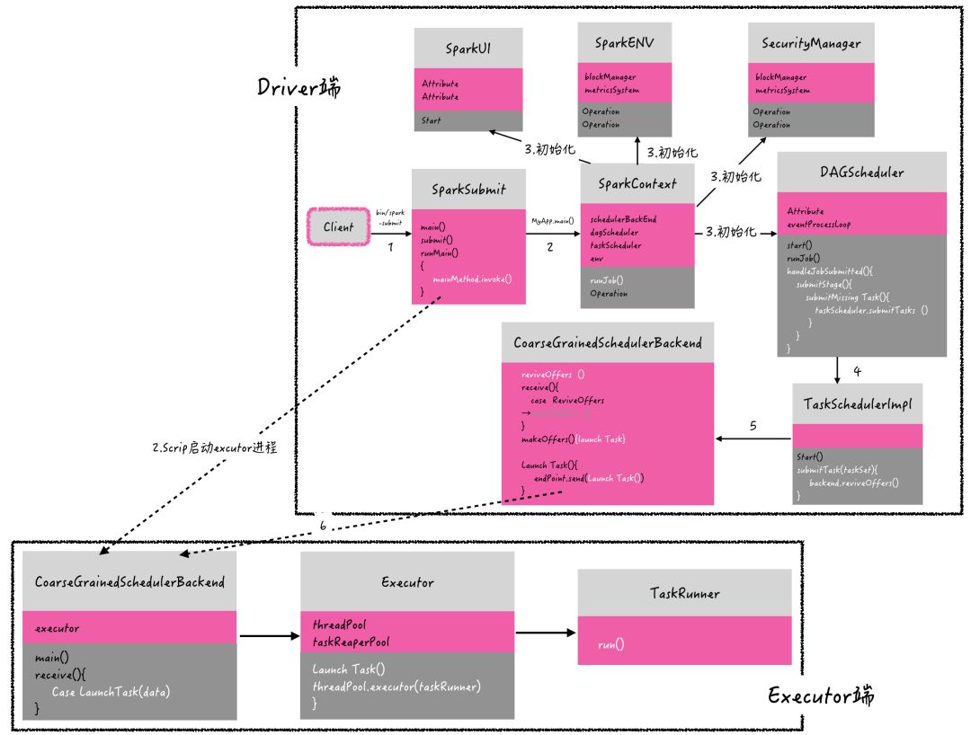 如图 6 所示是 Spark 的具体执行过程,client 提交作业,通过反射 invoke 执行用户代码 main 函数,之后开始启动 CoarseGrainedExecutorBackend 和初始化 SparkContext。