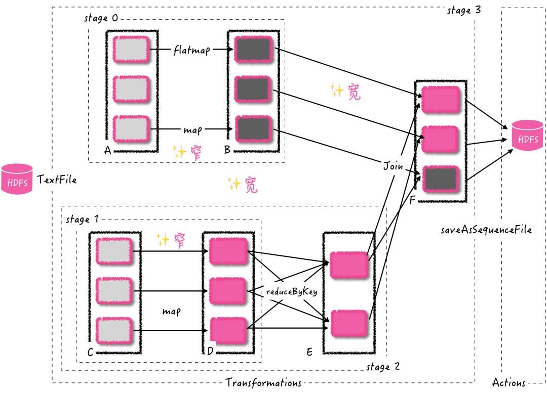 宽依赖是指父RDD的每个分区都可能被多个子RDD分区所使用,子RDD分区通常对应所有的父RDD分区。这个概念在下面的例子中会涉及。