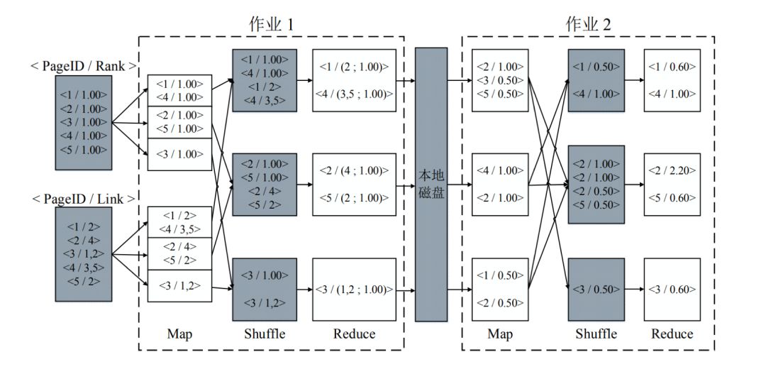 图 8 是 MapReduce 进行 pagerank 算法的一次迭代过程,需要注意的是灰色的部分都是需要存储到磁盘的数据。