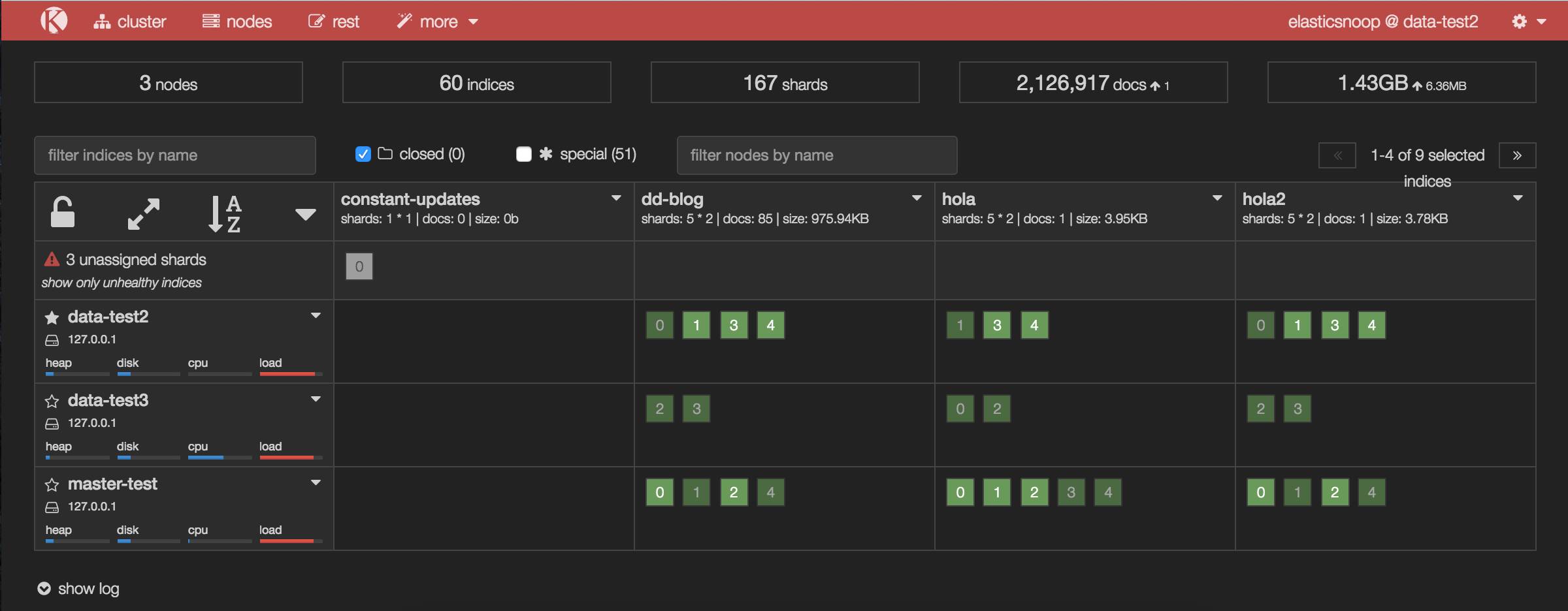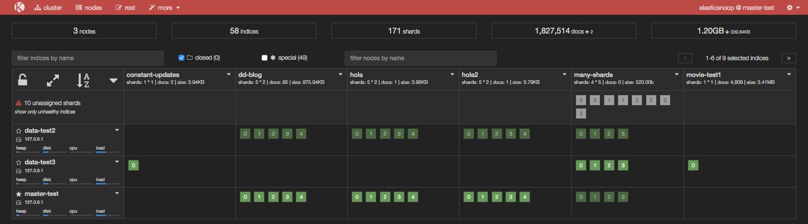 下面图示中,就是这样, 每个主分片有 4 个副本, 而总共只有 3个 nodes, 悲剧了。