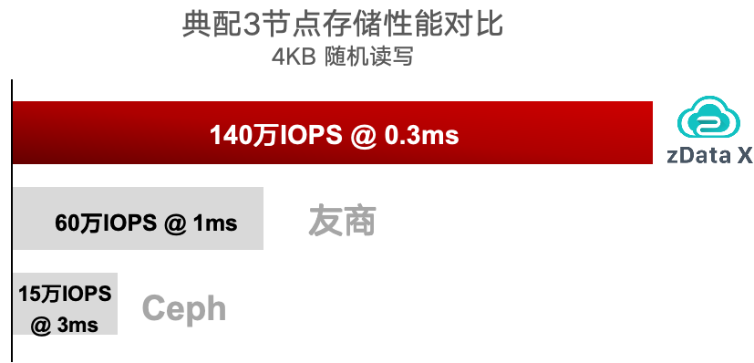 在种种优化手段和专利技术的加持下,zData X 的存储性能超传统Ceph架构9倍、业界同类产品2倍以上,能够在更低的时延下,提供更高的IOPS性能,满足数据库各类严苛的负载要求。