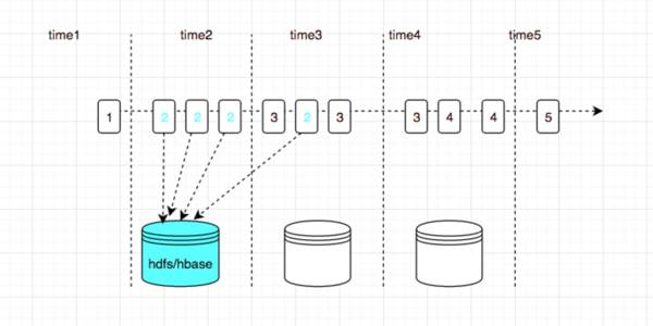上图中 time1,time2, time3等是我们 Spark straming 拿到消息将要处理的时间, 图中方块中的数字代表这个event 产生的时间, 有可能因为网络抖动导致部分机器上的日志收集产生了延迟, 在time3的batch中包含event time 为2的日志, 特别说明一下, kafka 中的不同分区的消息也是没有顺序的。