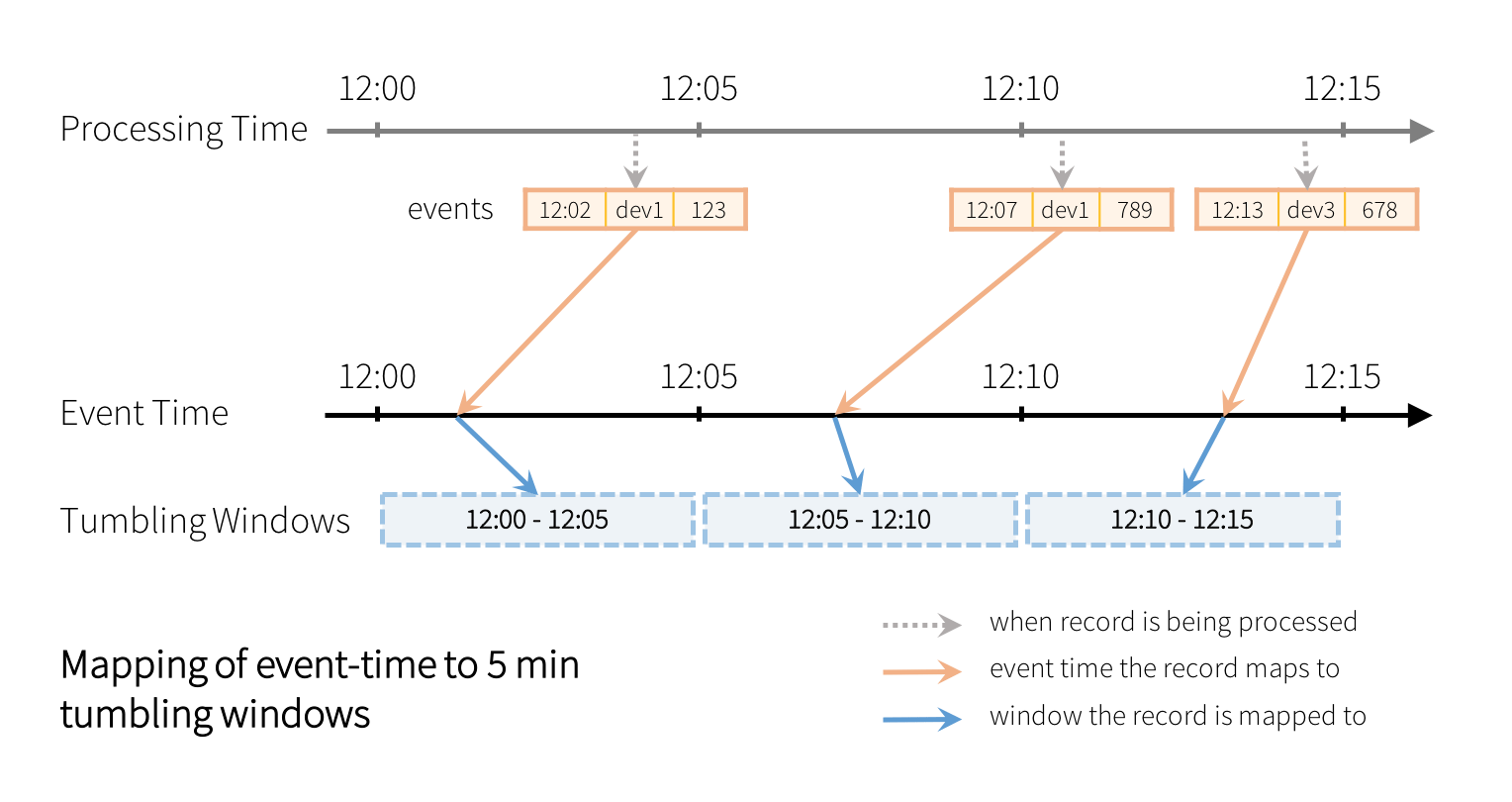 Event time :Event time是事件发生的时间,经常以时间戳表示,并和数据一起发送。带时间戳的数据流有,Web服务日志、监控agent的日志、移动端日志等;