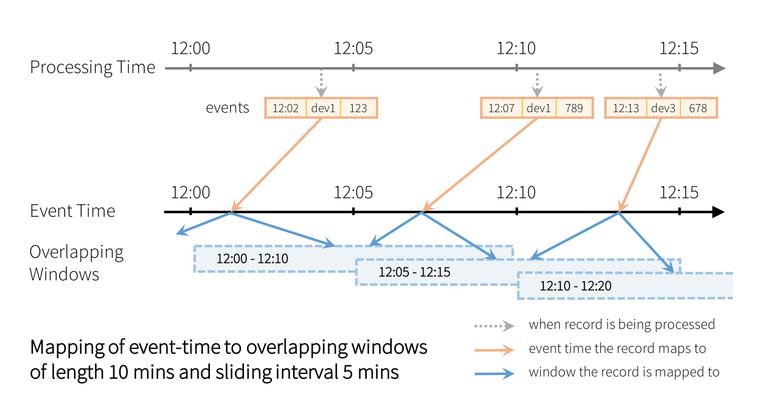 每5分钟统计过去10分钟内每个设备(注意这样按照 设备 和 重叠时间窗口同时分组)产生日志的条数, 如果一条日志因为网络原因迟到了,还是会把这条日志统计到属于它的分组里面。