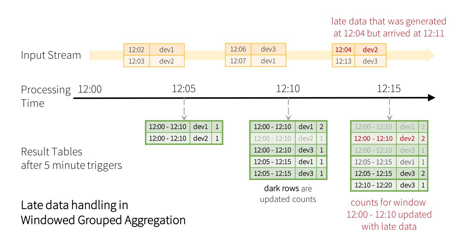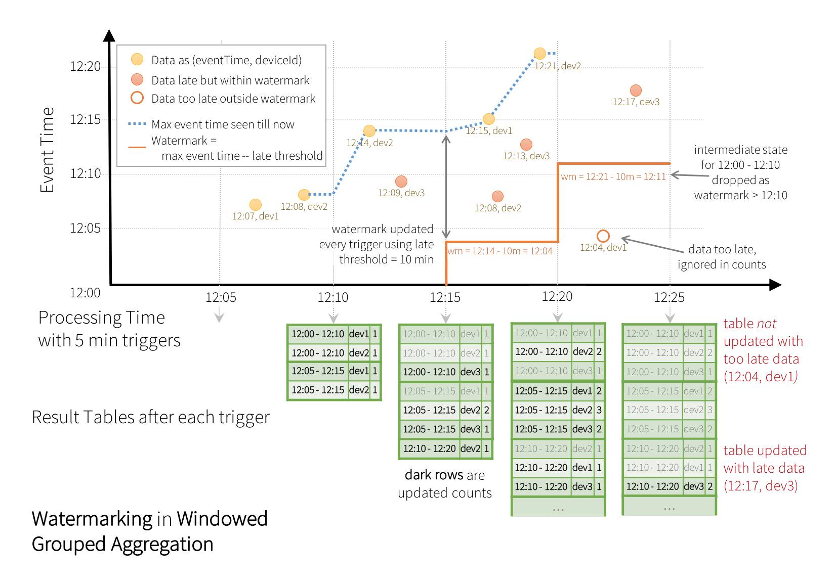 windowedCountsDF = \ eventsDF \ .withWatermark("eventTime", "10 minutes") \ .groupBy( "deviceId", window("eventTime", "10 minutes", "5 minutes")) \ .count()