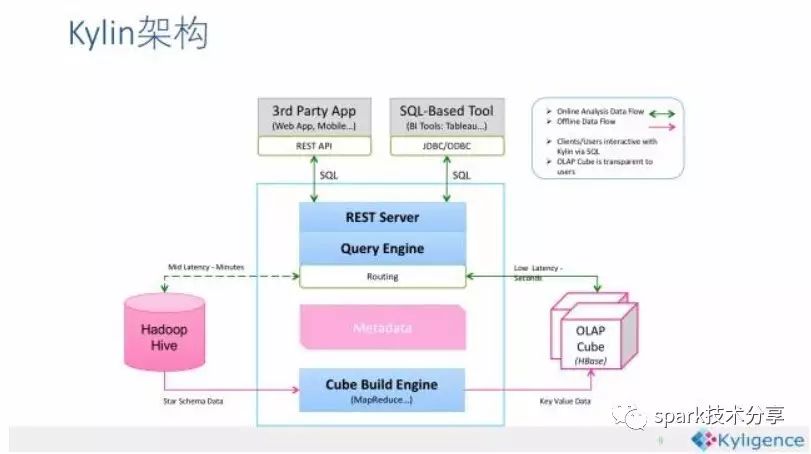 这个图里面能看到 kylin 的全部套路, 从 hive 中拿数据, 然后根据你定义的维度, 进行异步计算指标, 把结果存在 hbase 中, 查询的时候, 查询引擎把, 你的sql 解析为对应的 hbase 的查询,