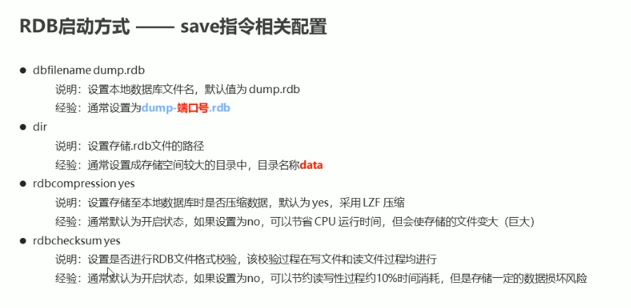 “save配置需要根据实际业务情况进行设置,频度过高或过低都会出现性能问题,结果可能是灾难性的。save配置启动后执行的是bgsave操作