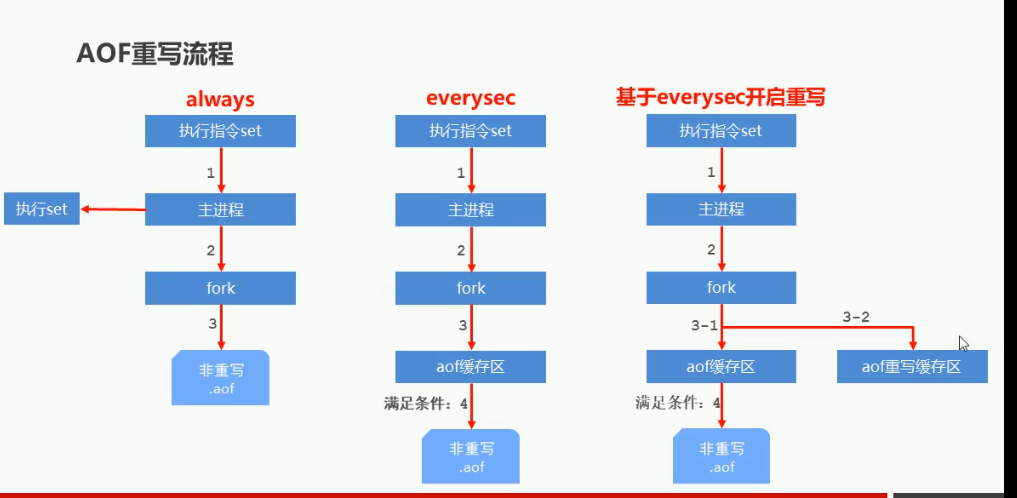 always(每次):每次写入操作都存储到AOF文件中,数据0误差,性能较差。 everysec(每秒):每秒将缓冲区中指令同步到AOF文件中,数据准确性较高,性能较高 no(系统控制):由操作系统控制,整体过程被可控