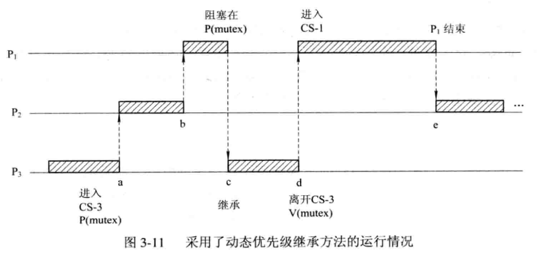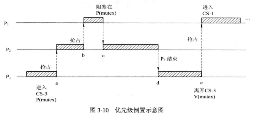 假如P3最先执行,在执行了P(mutex)操作之后,进入到临界区CS-3。在时刻a,P2就绪,因为优先级比P3高,P2就抢占了P3的处理机时间。在时刻b,P1就绪因为优先级比P2高,P1就抢占了处理机,但是因为临界资源被P3占用,因此,P1被阻塞。出现了高优先级进程被低优先级进程阻塞的情况。这是非常不正常的,而且对系统是有害的。