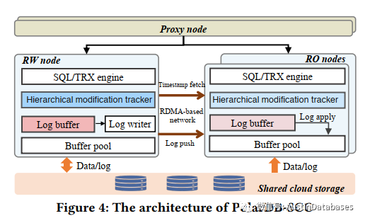 许多现有的系统以来与流式日志传输,并在RO节点上线性应用日志,并使用了特定的时间戳来标志事务的时间,RO节点在日志应用到特定的时间戳之前无法进行强一致的读,因为RO节点无法获知数据页面是否更改,在不知道前需要进行等待。