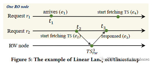 这里我们有两个读库的访问 R1 R2, 当R2 访问数据时请求了时间戳,并在T3 获得结果 TS3RW,这里R1 和 R2 在同一个RO 节点,这里有另一个访问的需求 R1 ,如果R1 对数据进行访问,根据本地时间戳原理,我们可以推测出 E1 E2 都可以采用 TS3RW作为时间戳,根据这个原理可以推出只要,在E3后如果在获取时间戳就需要在次进行获取,而在T3前的都可以使用TS3RW来进行,当在之后的数据访问,会明确之前的获取的时间戳是无效的,需要重新等待新的时间戳到来后,才能继续对读库进行访问,这样的设计就是为了在高并发的数据访问中,可以尽量少的对写库获取时间戳,而尽量复用时间戳的方式来访问读库。