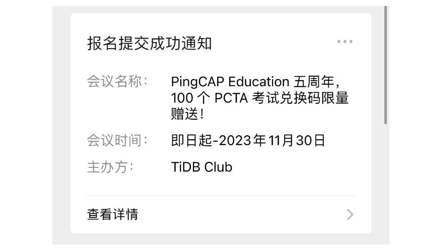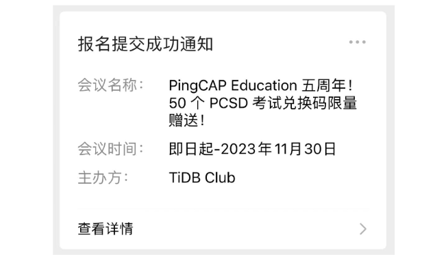 第二步:在 TiDB Club 服务号上会收到报名成功提示,点击【查看详情】