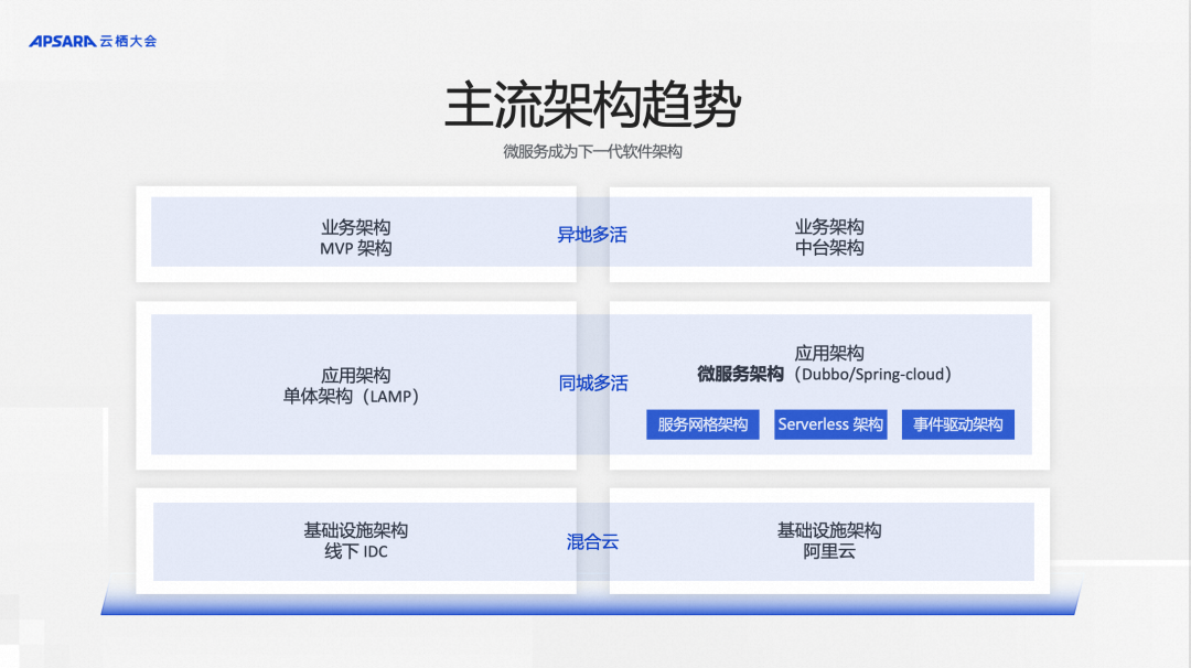 每一种架构都有时代的挑战和选择,没有最好的架构,只有更适合的架构。WEB 1.0 时代,更多的是信息的呈现,系统相对简单,早期一般购买物理机,采用经典的 LAMP 单体架构快速构建一个网站,业务复杂可以采用 MVP 思想进行分层化解。WEB 2.0 时代,交互复杂,互联网/移动互联网蓬勃发展,互联网充斥着快鱼吃慢鱼的故事,因此化解复杂系统的快速迭代的架构就是下一代架构。在基础设施这层采用云计算底座能够快速交付资源,采用微服务架构充分提升研发效率,解决复杂系统的研发效率问题;采用中台架构,解决复杂系统重复建设和基础服务能力沉淀问题。随着线上、线下的加速融合,稳定性要求越来越高,因此高可用成为每家企业必须重视的话题。如果在云上,云厂商会解决容灾问题,如果自建 IDC,可以采用混合云架构解决基础设施容灾问题;在应用架构层面,同城多活是解决应用容灾的通用方案;在业务架构层面,异地多活是解决业务容灾的最佳实践。随着数字化加深,整个时代架构会逐渐右移动,可见微服务会是下一代软件架构,会逐渐成为时代的主角。