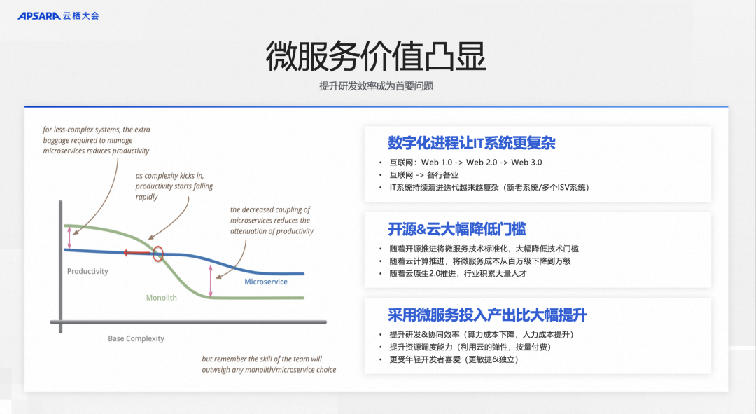 微服务架构在释放研发效率同时导致运维成本上升,但是 K8s 彻底解决了运维问题,让微服务迈过技术成熟度拐点,并且随着云原生架构加速演进,充分释放云的红利。
