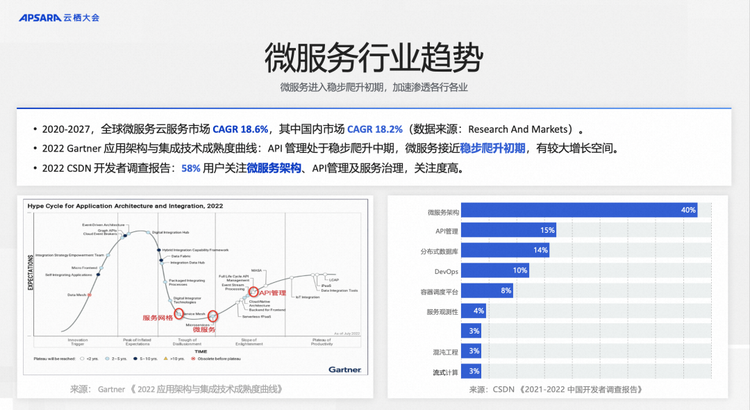 微服务市场每年保持 18% 以上增长,可见其爆发力之强;Gartner 报告显示,微服务进入稳步爬升初期,这意味着技术成熟、标准,加速渗透各行各业;CSDN 开发者报告则显示,58% 用户关注微服务架构,可见开发者将大规模越迁到微服务时代。