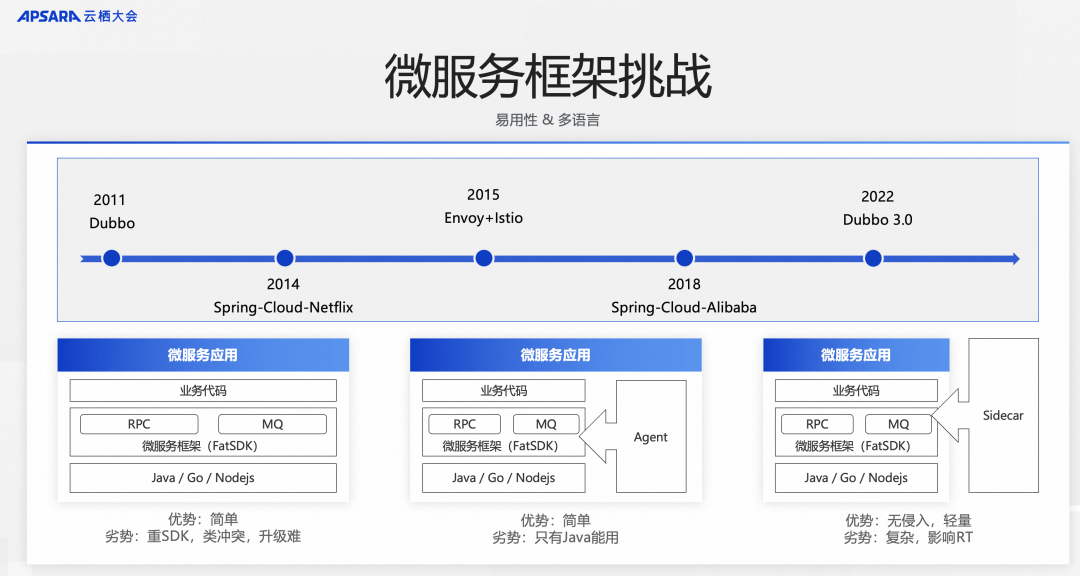 微服务框架核心要解决的是,如何像单体一样开发微服务应用,屏蔽分布式系统复杂度和多语言差异。2011 年阿里开源 Dubbo 框架,由于简单易用的优势快速成为国内首选,但是存在着序列化协议语言相关性高,多语言发展缓慢,重 SDK 模式、升级困难等问题。为了解决重 SDK 问题,我们引入了 Agent 的技术(Java 字节码增强),尽可能把复杂的治理功能下沉到 Agent 中,大幅缓解 SDK 生命周期管理问题,但是依然没有解决多语言问题。为了解决多语言问题,有两个基本思路,一个是通过 Sidecar 技术,在网络层通用解决一些流量治理问题,但这个思路会引入一个新的依赖,增加复杂度;另外一个思路是发展利于多语言实现的序列化协议,目前主要有 Http + Json 和 gRPC(基于 HTTP2.0)+ PB 两个路径。我们基于第一性原理判断,最终 RPC 调用类似 HTTP 调用,不应该引入一个 Sidecar 的复杂度,应该按照标准化和轻量化方向演进,因此我们 Dubbo 3.0 推出了 Triple 协议(基于 HTTP gRPC),解决多语言问题,数据面控制面分离,客户端轻量化。
