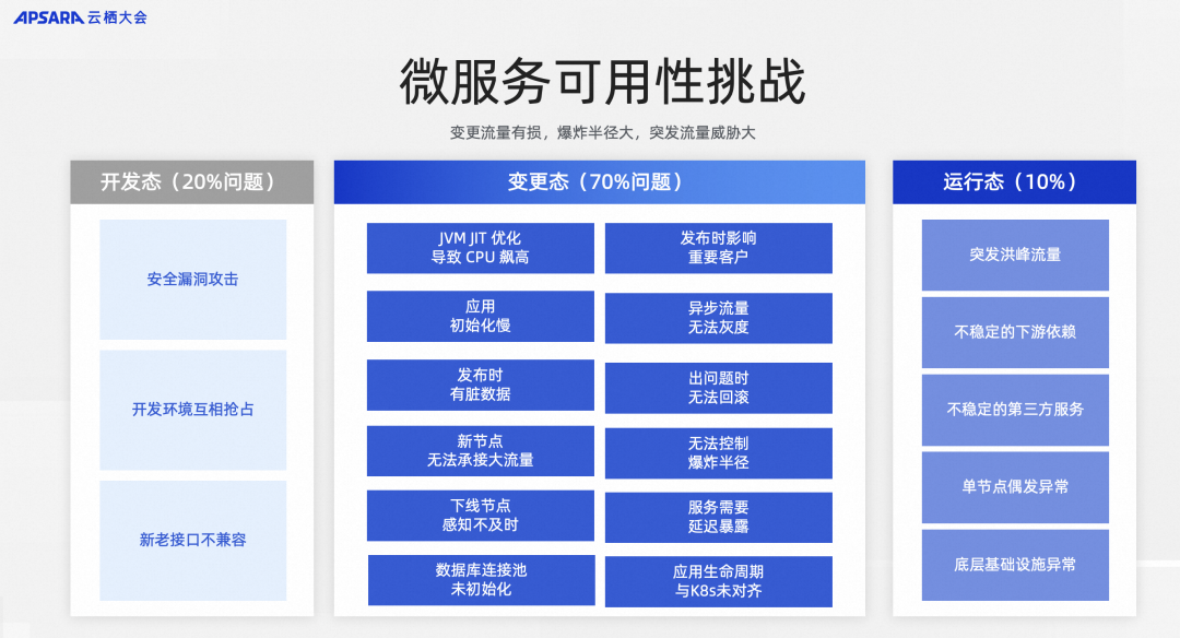 实践数据表明,系统变更会引入 70% 风险。如采用微服务后第一个遇到的是发布流量损失,核心原因是节点下线通过注册中心通知下游有延迟,上有系统不能及时摘除下线节点,导致调用异常;由于应用多,变更时间不同,依赖复杂,会导致变更产生的风险变多。运行态会引入 10% 左右风险,比例虽小但是风险极大,这类风险主要有三类,一类是被上游系统突发流量和攻击压死,一类是被下游不靠谱依赖拖垮,一类是被运行机器抖动拖死;