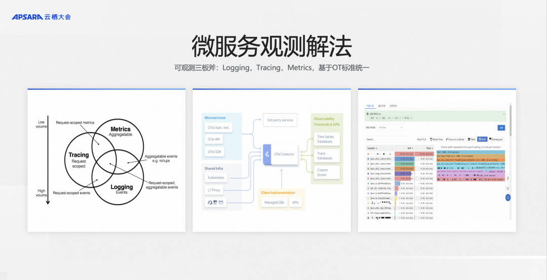 微服务观测目前方法论比较充分,通过 Metrics 定性大概是业务问题还是中间件问题,通过 Tracing 定量分析是哪个应用问题,通过 Logging 定位具体根因。OT 标准的出现,加速了技术迭代,解决复杂链路问题,大幅提升分析诊断效率。