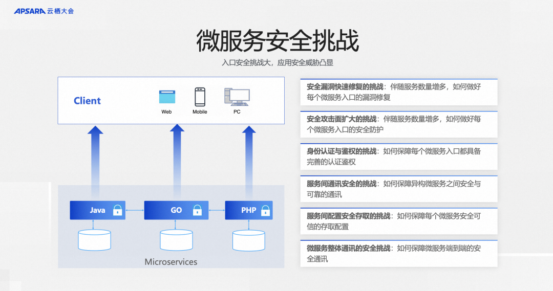 从单体演进到微服务后,会大幅提升业务研发效率,但是也会带来架构的复杂性,开发需要先解决 RPC 调用复杂问题,发布解决变更有损可用性问题,出故障需要解决登陆很多机器解决才可定位的问题,面对黑客需要解决安全问题。这就是微服务核心的四个挑战,下面我们将逐步分享我们的解法。