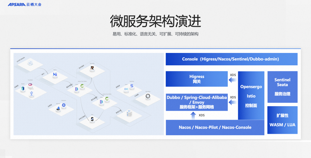 未来微服务会沿着易用、标准化、语言无关、可扩展、可持续架构演进;微服务框架解决易用性和多语言问题,控制面解决标准化和可扩展问题,可持续架构是从小到大可以持续演进,而不是第一天就搞一个巨复杂架构。小的时候可以 Dubbo+Nacos 快速开始,遇到安全问题上云原生网关 Higress,遇到稳定性问题上服务治理,遇到一致性问题引入 Seata(启动贡献 Apache 社区),一步步持续生长。