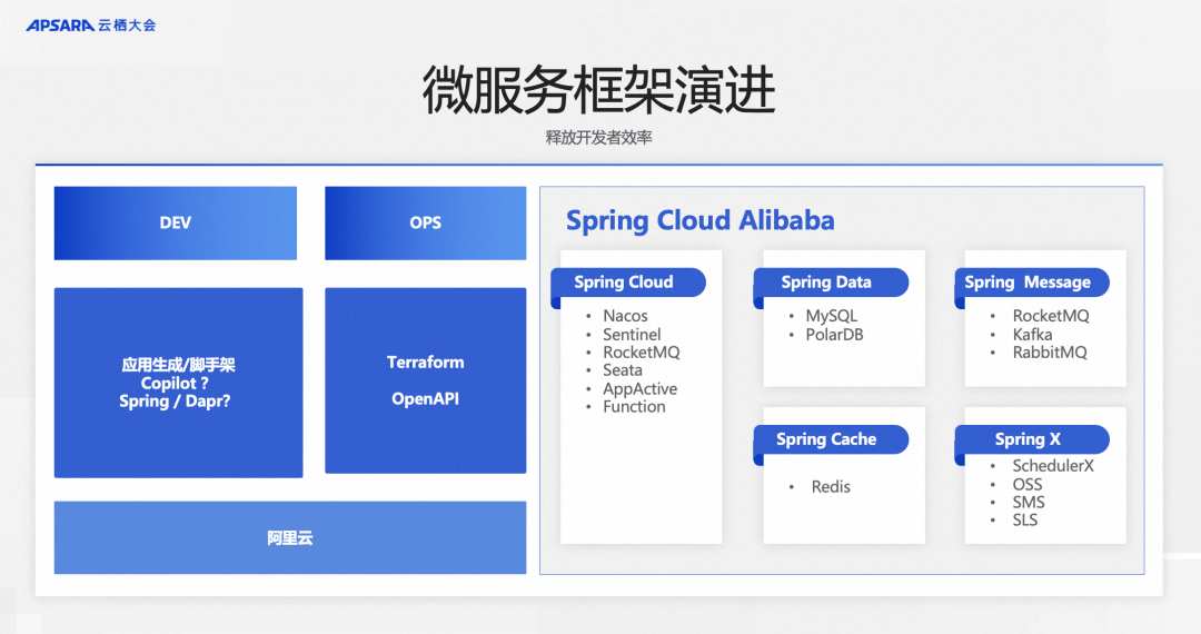 对于 OPS 同学,掌握 K8s + Terraform 就可以高效的运维;面对开发者,我们通过 Spring-Cloud-Alibaba 帮助开发者解决微服务开发效率问题。未来,我们将扩大范围,做开发者和阿里云的链接,通过 Spring 注解快速使用阿里云主流云产品,大幅提升开发者效率。