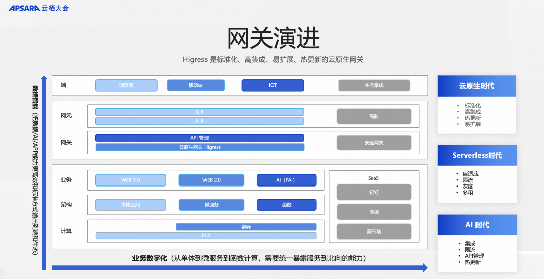 WEB 1.0 主要采用 SLB ALB + ECS + 单体架构,支撑简单的信息系统。WEB 2.0 主要采用云原生网关 + 容器 + 微服务架构,支撑复杂交互系统;从单体到微服务,SLB 微服务网关彼此不能互通,从微服务到 ACK,微服务网关和 Ingress 网关彼此不能互通,导致在架构演进中会出现流量网关、微服务网关、安全网关多层叠罗汉现象,带来运维和部署复杂度提升。因此,我们推出云原生网关 Higress,将三层网关合一,基于 Ingress 标准整合微服务和安全网关能力,提供服务治理差异化竞争力,相比 Nginx 生态网关,Higress 采用 Envoy 内核,从规则、路由、证书、插件实现全部热更新,避免链接抖动带来的用户中断和体验下降。未来云计算发展有两个主导力量,一个是 Serverless,把算力发挥到极致;一个是 AI,把数据挖掘到极致。面对 Serverless 时代,网关需要突破自适应能力(流量来后端服务没有拉起 Hold 流量,后端服务拉齐转发下去),目前 MSE Higress + ASK SAE 已经全部跑通,阿里云 FC SAE 会内置 Higress。面对 AI 时代,网关需要双向流传输性能和链接稳定性有很高要求,协议上需要支持 SSE/WebSocket 等双向流协议,需要热更新能力保证链接稳定,目前通义系列和 PAI 等开始集成 Higress。