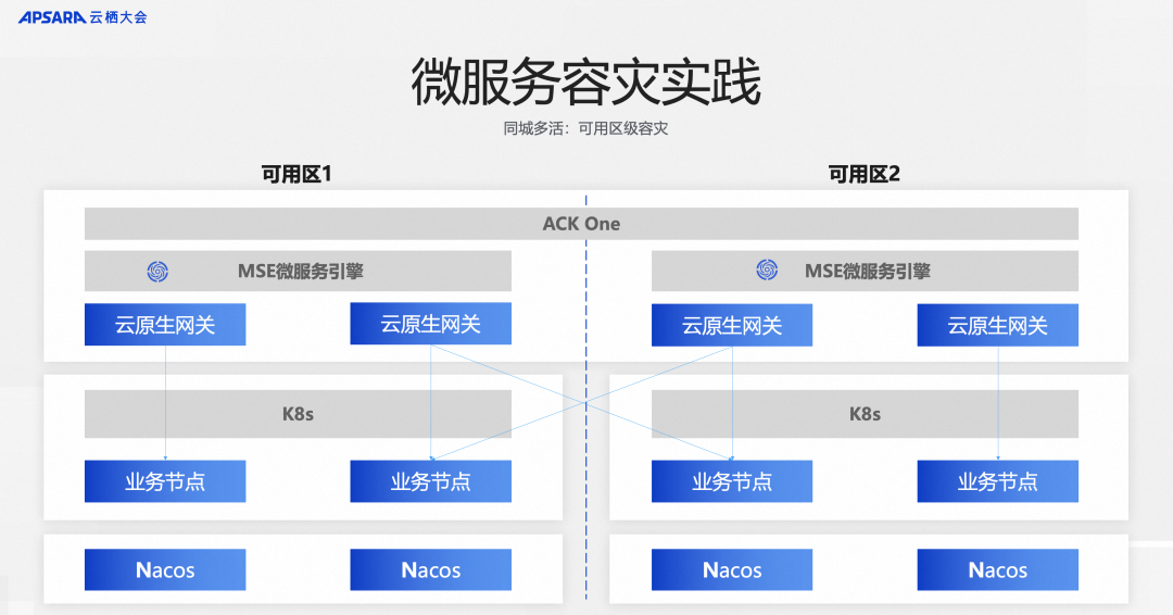 解决完单集群高可用问题,我们需要解决多 AZ 容灾问题,进一步提升微服务高可用体系。下面有两个可用区,每个可用区有一个 K8s 集群,通过 ACK One 轻松管理两个集群。面对入口流量我们有两个选择,一个选择是一个网关集群,聚合两个 K8s 服务,可以通过网关灵活切换不同可用区容量;一个是选择两个网关集群,通过上层 DNS 切换流量,这样架构简单,但是切流实时性无法保障。如果我们真的想像用水电一样使用云服务,未来 Serverless 一定是关键方向,让用户能够聚焦业务开发,让云逐渐带大家走到自动挡,自动驾驶时代。目前在云上可以通过 SAE + MSE 体验 Serverless 的优势,加速推进 Serverless 进程,进一步释放云计算红利。在“阿里巴巴中间件”公众号后台,回复关键词:微服务,即可下载本次大会分享材料。