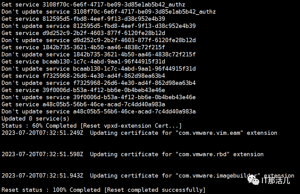 service-control --stop –all #停止所有服务 service-control --start –all #启动所有服务 service-control –status #服务状态查看 service-control --stop vmware-vpxd #单个服务停止 service-control --start vmware-vpxd #单个服务启动