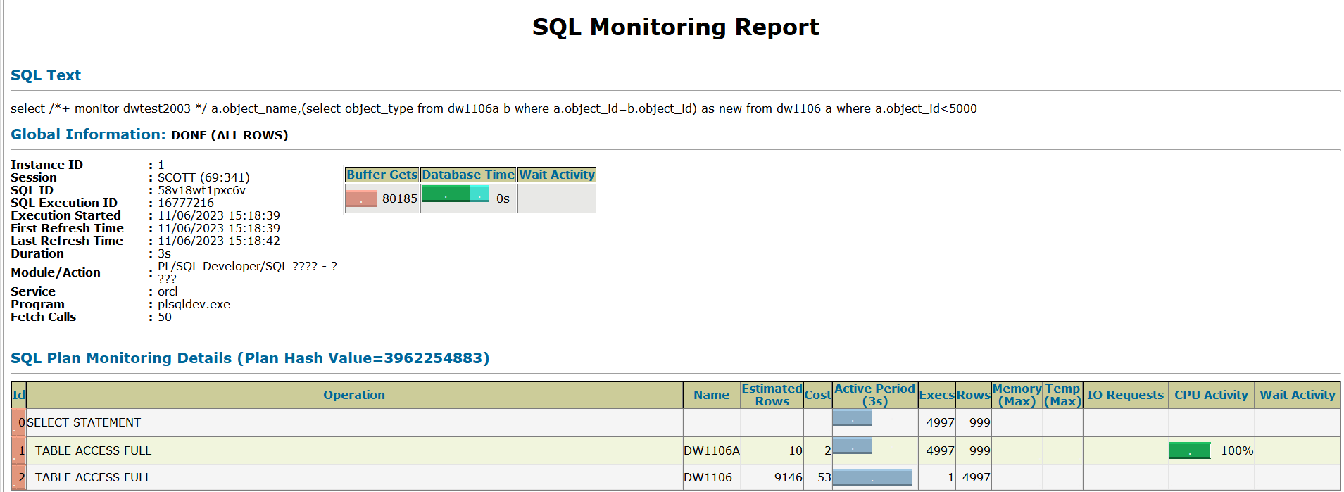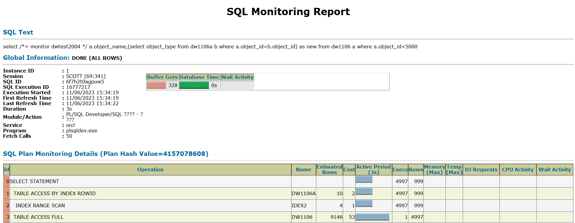可以看到DW1106A 被执行了4997次,因为select count(1) from dw1106 a where a.object_id<5000; a.object_id<5000对应的行数就是4997;