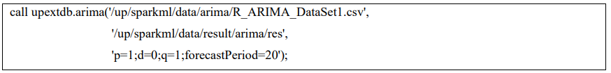 UP 的 ARIMA 算法包含 3 个参数,arima(source,target,setting),其中: source 和 target 则分别代表输入数据和输出数据 setting 表示算法的参数设置,forcastPeriod 表示预测周期