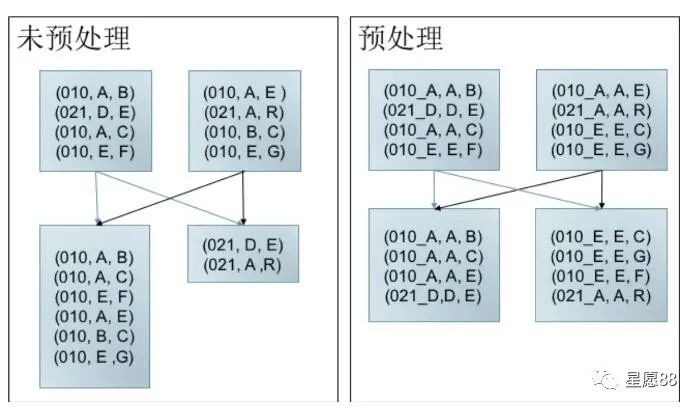 数据倾斜是指任务间处理的数据量存在较大的差异。如左图所示,key 为010的数据较多,当发生shuffle时,010所在分区存在大量数据,不仅拖慢Job执行(Job的执行时间由最后完成的任务决定)。而且导致010对应Task内存消耗过多,可能导致OOM. 而右图,经过预处理(加盐,此处仅为举例说明问题,解决方法不限于此)可以有效减少数据倾斜导致 的问题