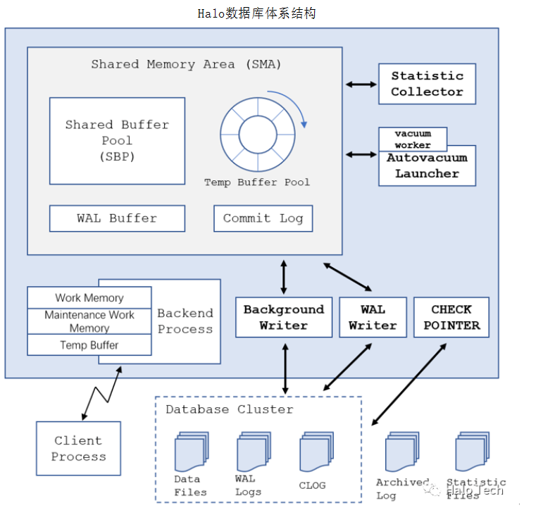 Halo数据库实例主要包含共享内存区域、本地内存区域和一系列后台进程。其中共享内存区域主要由共享缓存、事务日志缓存构成。后台进程主要由Background Writer(数据写进程)、WAL Writer(事务日志写进程)、Checkpointer(检查点进程)、Statistic Collector(统计信息收集进程)、Autovacuum(自动清理进程)以及Backend Process(会话进程)等构成。数据库群集主要由数据文件、事务日志文件及其它一些辅助文件组成。