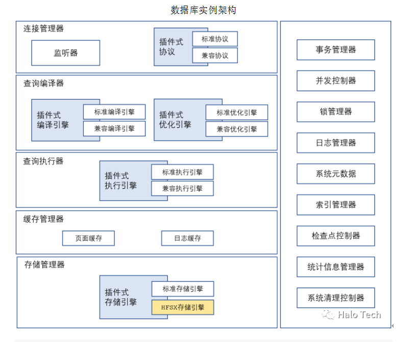 Halo数据库实例的主要成分。通过插件式内核的设计,可以非常灵活的实现多种协议的兼容、多种语法的兼容、以及分布式存储引擎(HFSX,发展中技术)的支持等,这个重要特性也是Halo能够称之为新一代统一数据库的重要原因。