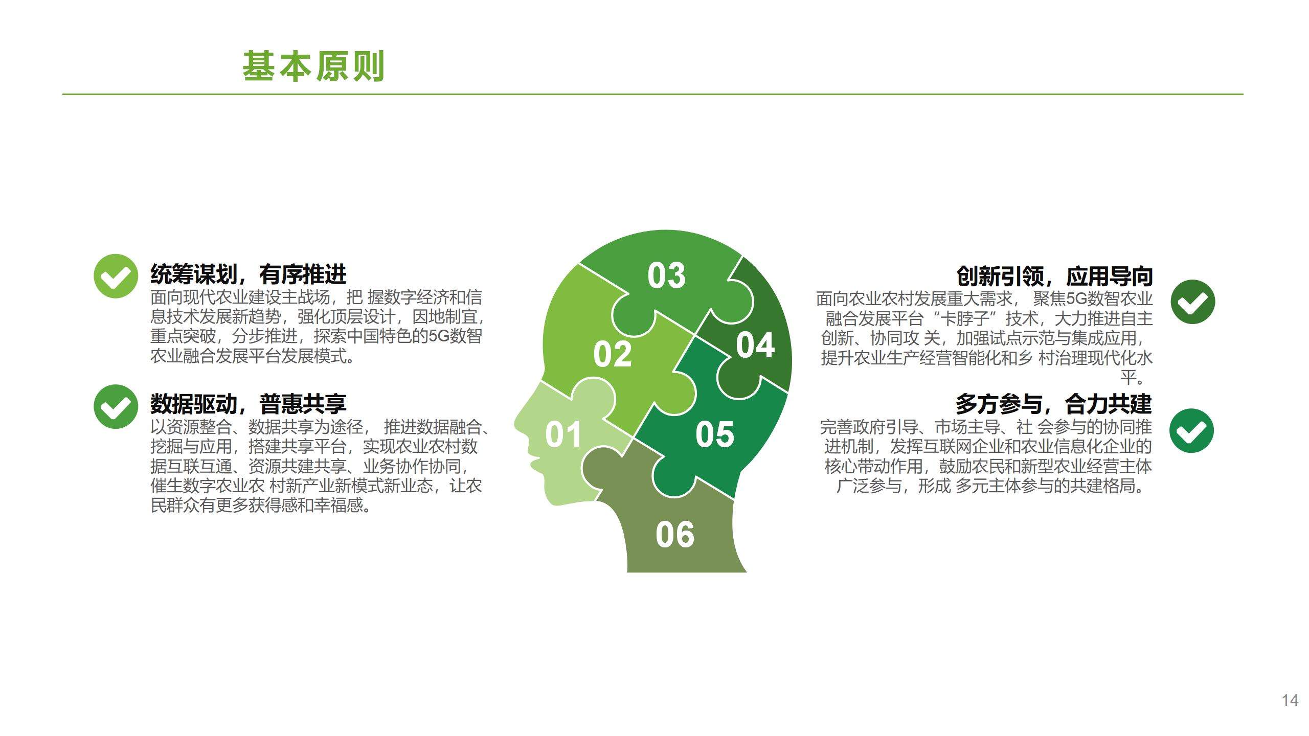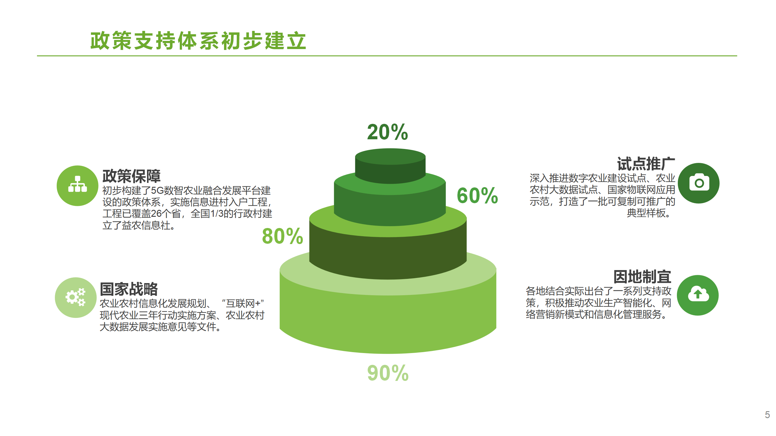 5G智慧农业数智融合方案,结合物联网,人工智能,云计算,大数据等前沿技术,打造了5G+数 字化种植、5G+远程智能控制、5G+智能云管 控、5G+AI农作数据模型等一系列应用场景。