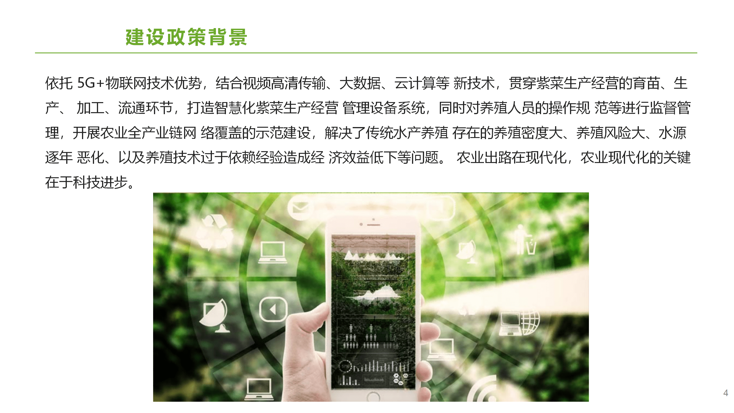 依托 5G+物联网技术优势,结合视频高清传输、大数据、云计算等 新技术,贯穿紫菜生产经营的育苗、生产、 加工、流通环节,打造智慧化紫菜生产经营 管理设备系统,同时对养殖人员的操作规 范等进行监督管理,开展农业全产业链网 络覆盖的示范建设,解决了传统水产养殖 存在的养殖密度大、养殖风险大、水源逐年 恶化、以及养殖技术过于依赖经验造成经 济效益低下等问题。