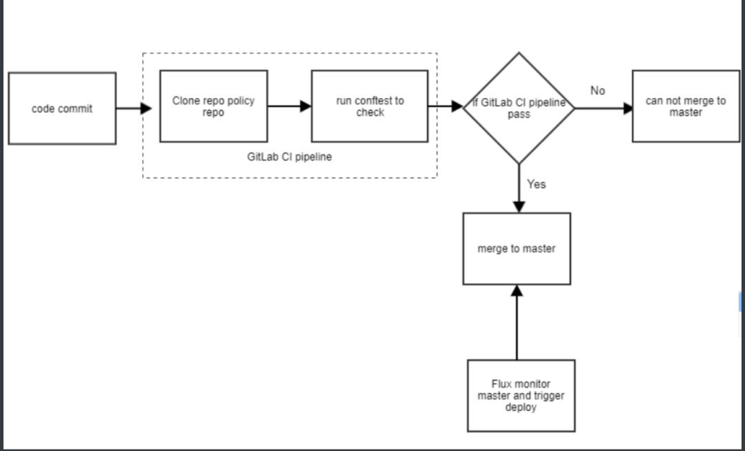 最后一步,我们定义 CI Pipeline:.GitLab-ci.yml 文件,当开发提交了代码到 GitLab 中,这个 pipeline 会使用上面的 docker image 去运行,然后使用 conftest 这个工具去检查是否符合我们 repo-policy 这个 git repo 定义的所有 policy,如果符合,则这次构建成功,否则构建失败。构建成功之后,我们合并此次代码到 master 分支,然后 GitOps 会监控到 master 分支的变化部署到 Kubernetes 中。