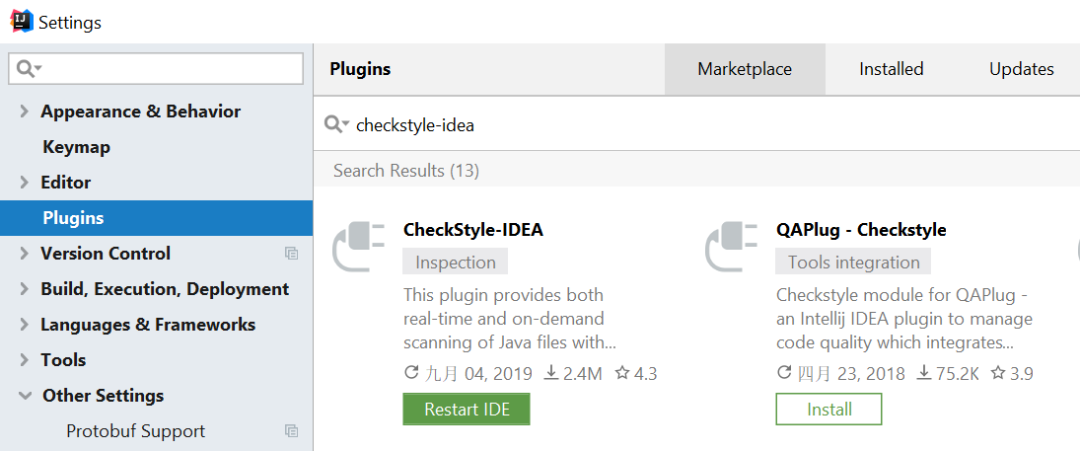 Checkstyle 提供了支持大多数常见 IDE (如 Eclipse,IDEA)的插件,文本主要使用 IDEA中的 Checkstyle 插件。安装方式:进入Settings >> Plugins >> Marketplace...,然后在 Merketplace 中搜索 CheckStyle-IDEA,点击Install,安装完后重启IDEA即可在IDEA底部的 ‘CheckStyle’ 看到它的功能按钮,点击