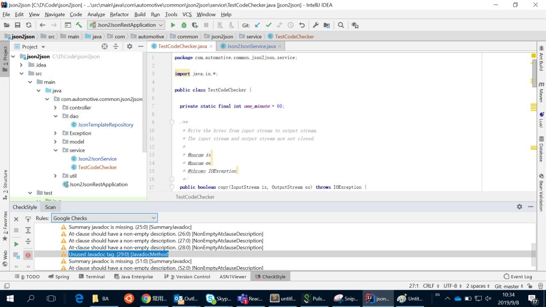 Checkstyle 具有高度可配置性,可以支持几乎任何编码标准。一个典型的配置就是使用内置的 Google Java Style 或 SUN Checks编码规范。如下图所示,Checkstyle 使用 Google Java Style 对代码进行编码风格检查,并将检查结果显示在IDEA底下 ‘CheckStyle’ 视图中;Checkstyle 还支持实时代码扫描。无论是手动检查还是实时检查,找到的代码缺陷都会高亮在代码编辑器中和右侧的代码滚动条上。开发人员可点击查看错误或警告的描述。