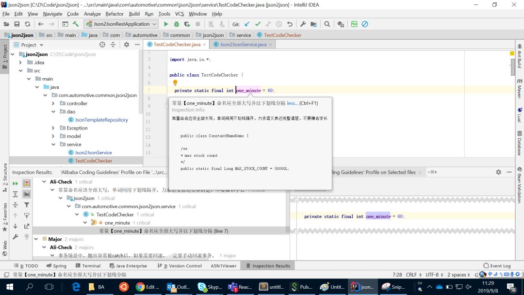 当 Alibaba 插件对项目代码进行编码风格检查完后,其检查结果显示在 IDEA 底下 ‘Inspection Result’ 视图中,如下图所示;点击警告信息,右侧将缺陷代码片段显示出来,同时找到的代码缺陷也会高亮在代码编辑器中和右侧的代码滚动条上。开发人员可点击查看警告的详细信息,按 “Crtl+F1” 后会显示修复建议以及良好代码的例子,同时针对一些简单的缺陷代码还带有一键修复的功能。