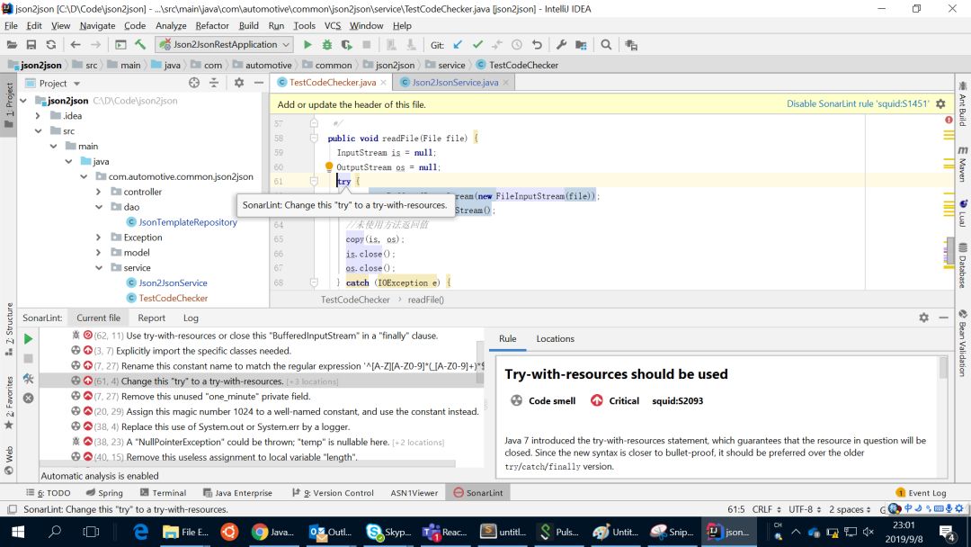 和Alibaba的插件类似,当 SonarLint 插件对项目代码进行编码风格检查完后,其检查结果显示在 IDEA 底部 ‘SonarLint’ 窗口中,如下图所示;点击警告信息,右侧可显示规则的描述和缺陷代码片段显示出来,同时找到的代码缺陷也会高亮在代码编辑器中和右侧的代码滚动条上。开发人员可点击查看警告的详细信息,按 “Crtl+F1” 后会显示违反的规则详情以及修复建议。此外,SonarLint 还有许多选项如:排除不想分析的文件;只分析特定的一组文件,如只分析修改过的文件;按需激活或关闭规则。